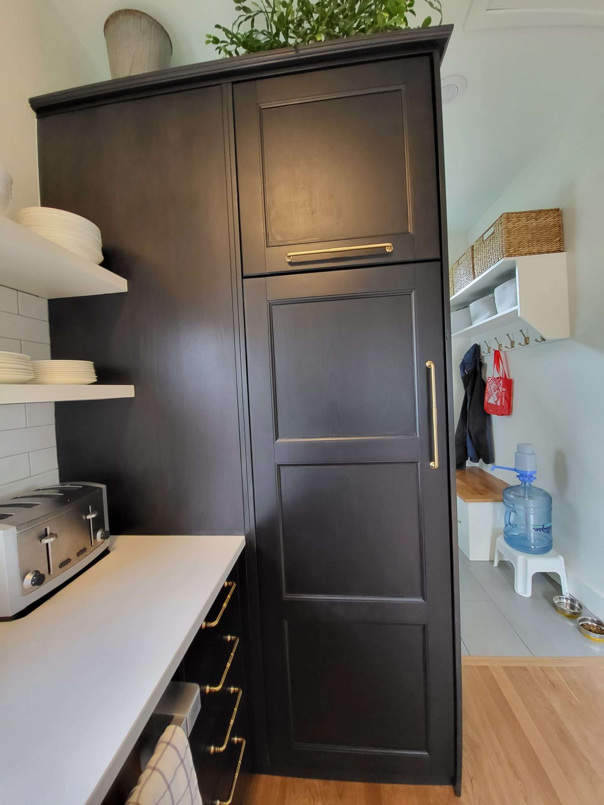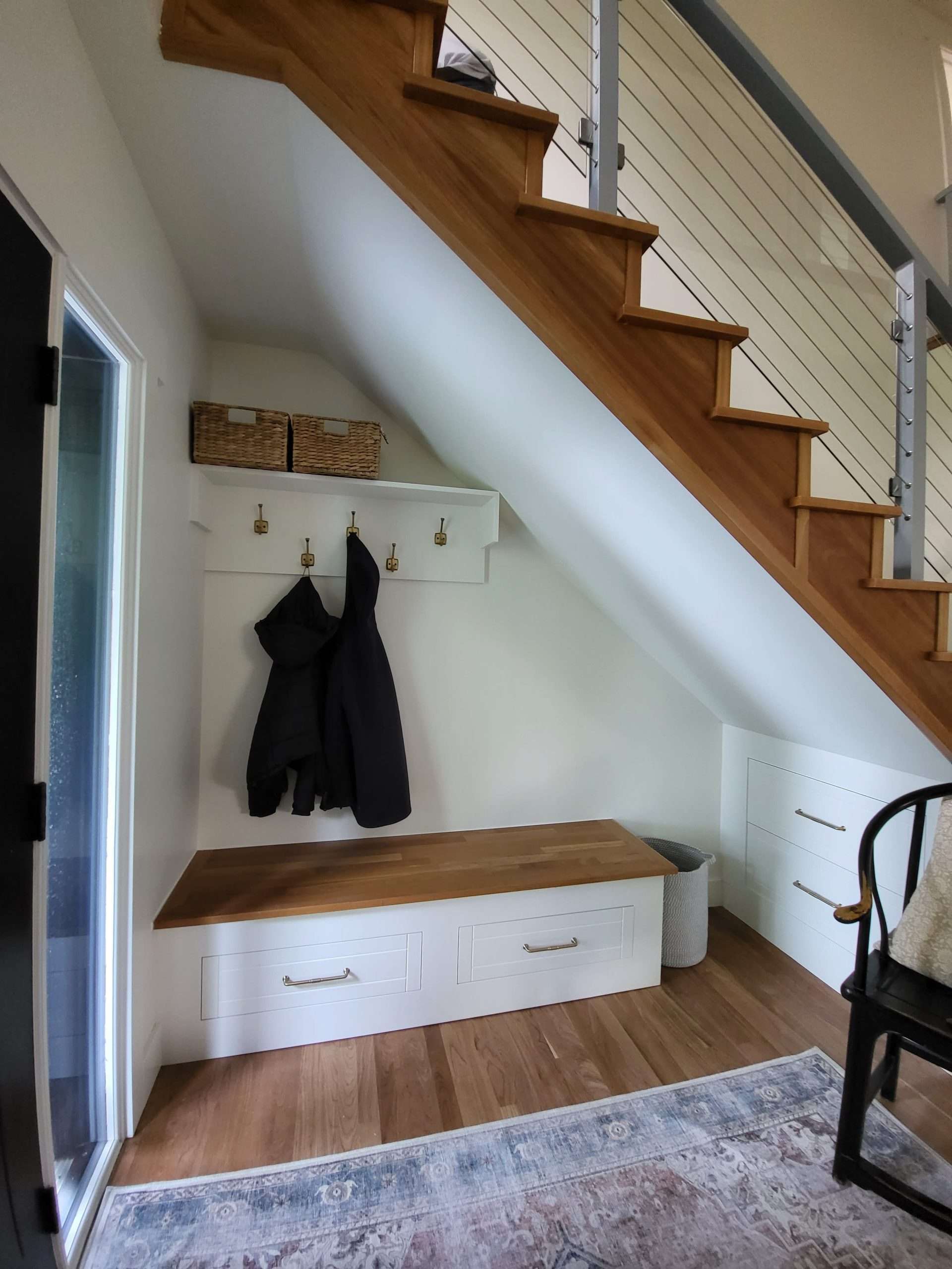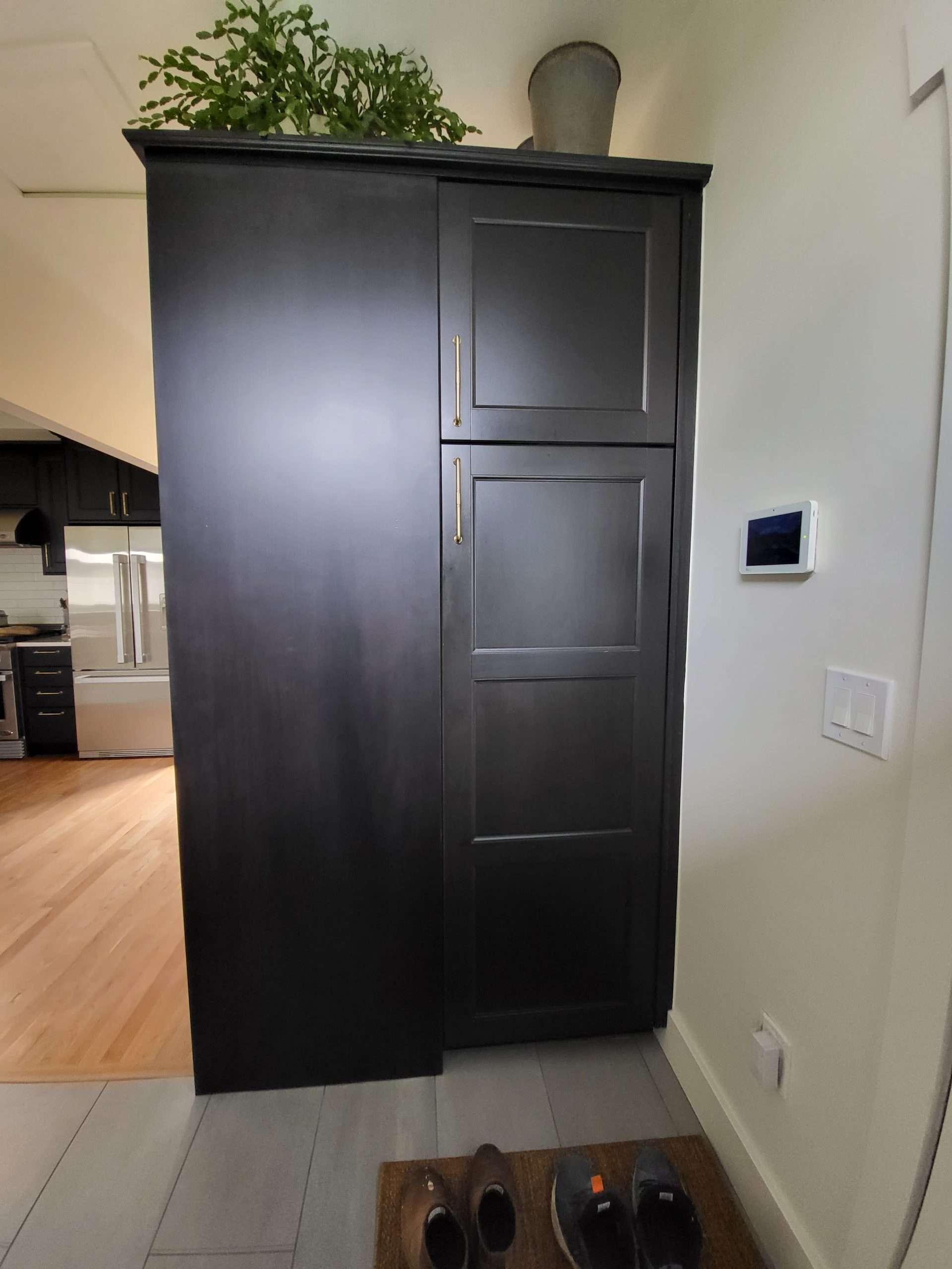 After the removal of mirrors and coat racks (both glued and screwed into the walls and cabinets). We repaired the imperfections, prepped the areas of concern then painted or stained (color match to existing cabinetry). After completing the staining, we then added a protective clear coat to the newly stained areas.